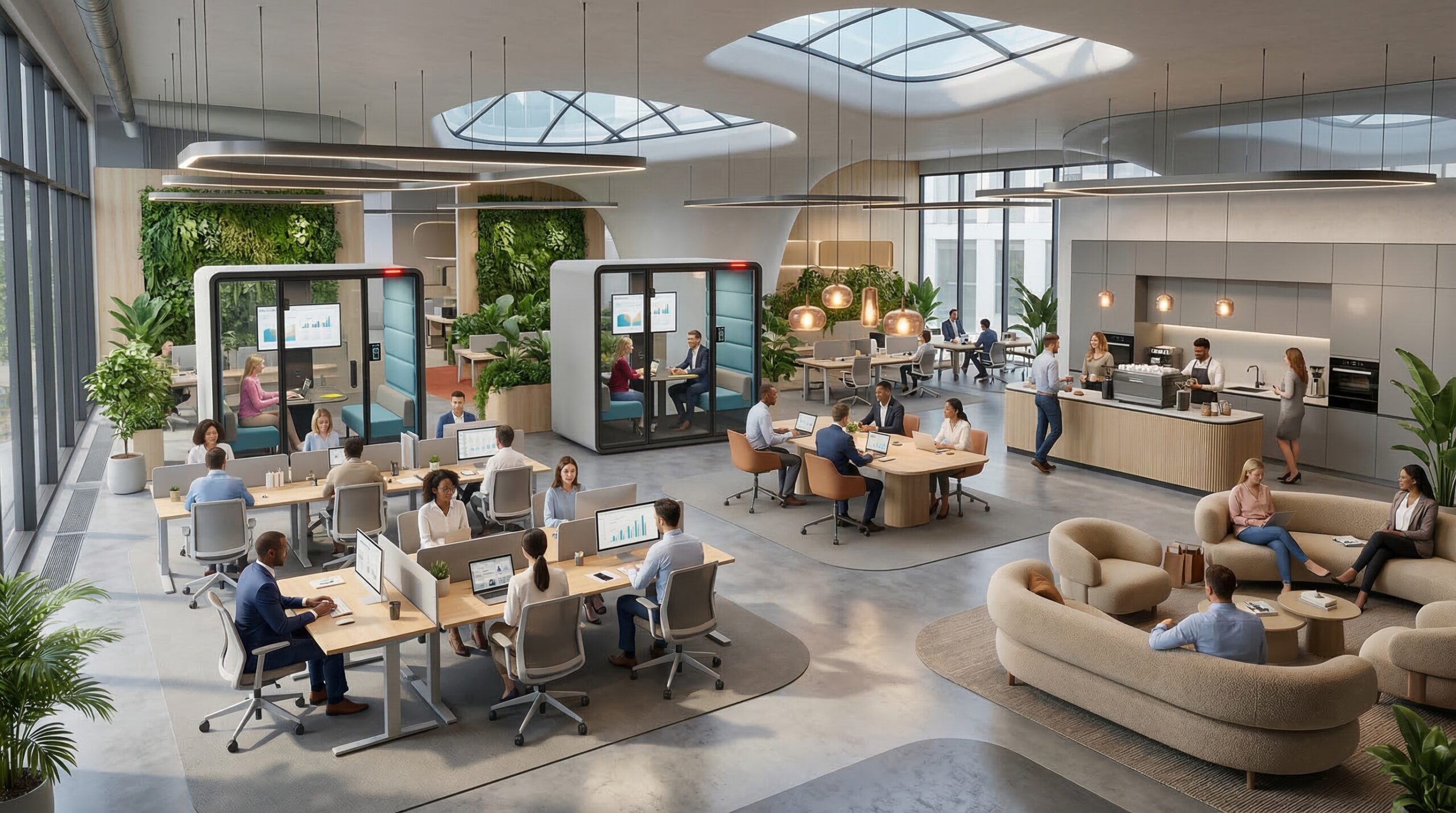 Moderne Bürokonzepte wie Activity Based Working, Open Space und Desksharing fördern Flexibilität und Zusammenarbeit. Solche Konzepte unterstützen gesundes Arbeiten und steigern die Leistungsbereitschaft. Wenn Sie ein Büro Ihrer Firma modern einrichten möchten, können Sie Konzepte der modernen Büroplanung wie offene Bürolandschaften und spezialisierte Arbeitsbereiche für hybrides Arbeiten als Beispiel nehmen.